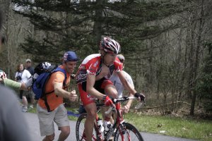 While it is incredibly illegal, there is something special about being able to TOUCH your favorite athlete as they compete. Thats Tom Zirbel in the picture getting a little help up Brasstown Bald, but the point here is, these fans came out to see the race, and had such good seats, they could touch the riders, feel the sweat, and smell the grease. Yesterdays stage had 130 miles of course, which means 130 miles of seating for fans. Go watch a bike race!